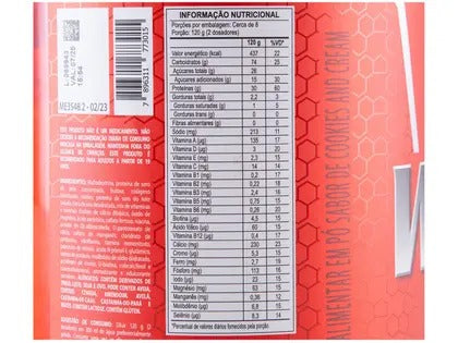Maltodextrina, proteína do soro do leite concentrada e isolada, frutose, colágeno hidrolisado, cookies, clara de ovo desidratada (albumina), mix de vitaminas e minerais, aromatizante e edulcorante sucralose.